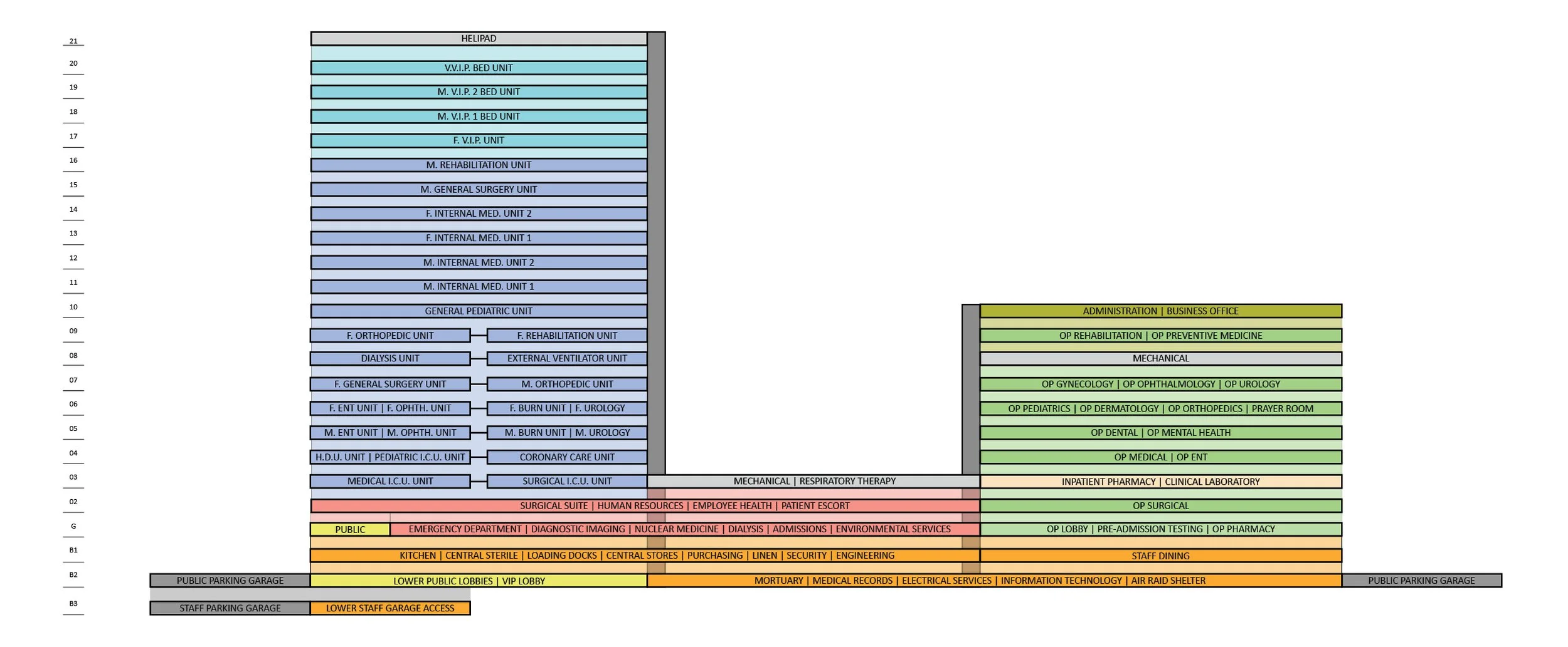 The project is to develop a new ultra-modern hospital for the Ministry of Interior ( Kuwait Police ), with the Ministry of Public Works acting as the Client. The 500-bed hospital, located in the Al-Sabah Health zone along Jamal Abdul Nasser Street; incorporates a wide variety of medical specialties and inpatient facilities.