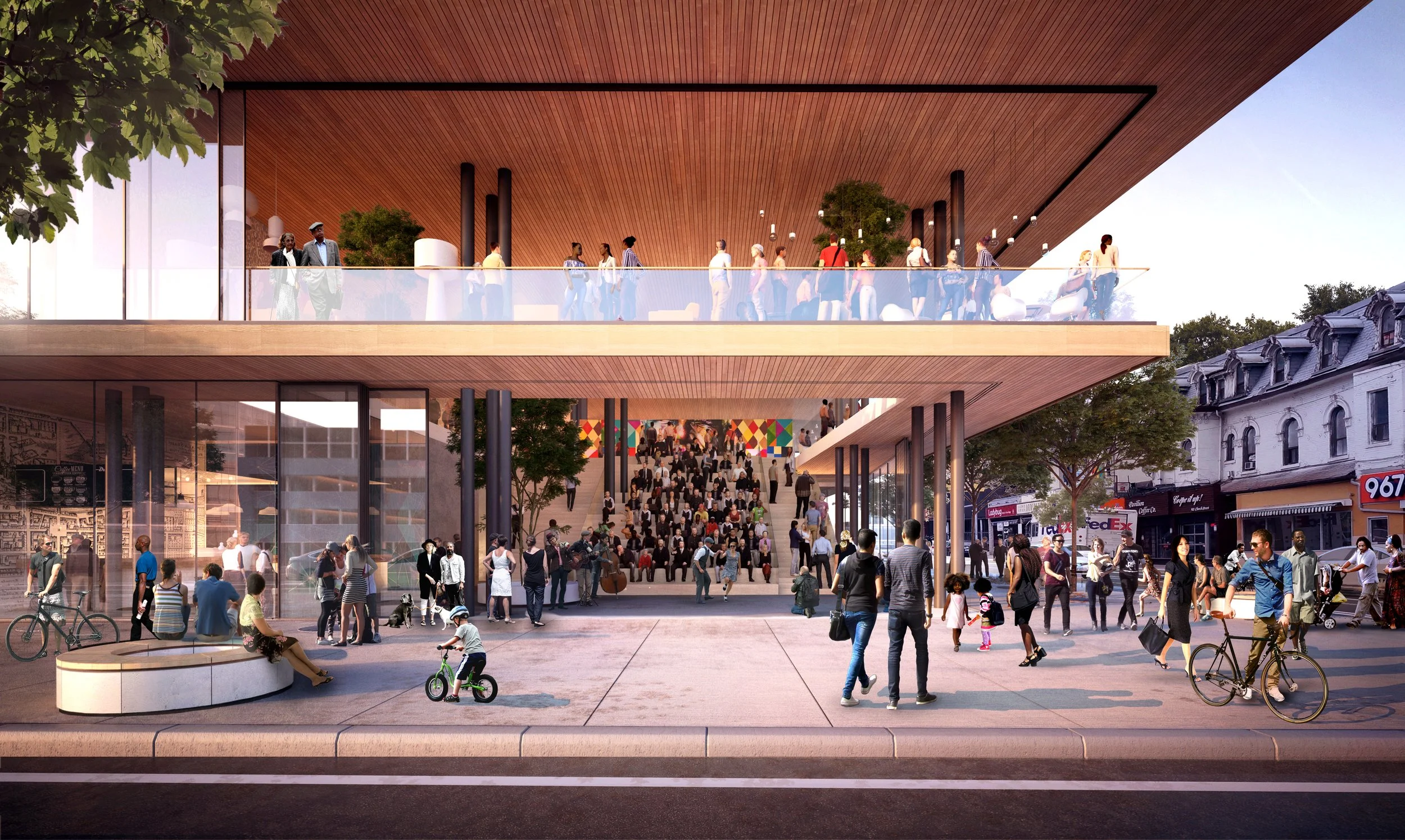 The most visible gesture of that celebration is a two-story plaza that faces the intersection. This balconied piazza, or the public space, is intended to facilitate community activity, both informal gatherings as well as marquee events such as during Toronto’s annual pride. The floors are connected by a grand staircase that serves as a seating area, as well as a way up and down. The upper level "catwalk" is intended as a vantage point for watching the street, and retractable glass can open or close off the plaza depending on the weather.”